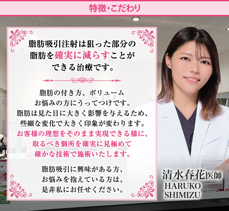形成外科出身の女医である清水春花先生が培ってきた経験で、お客様の悩みに寄り添った視点で最適な解決方法をご提案いたします。