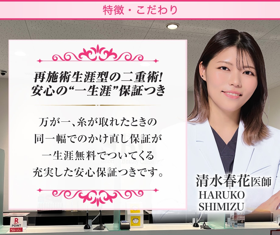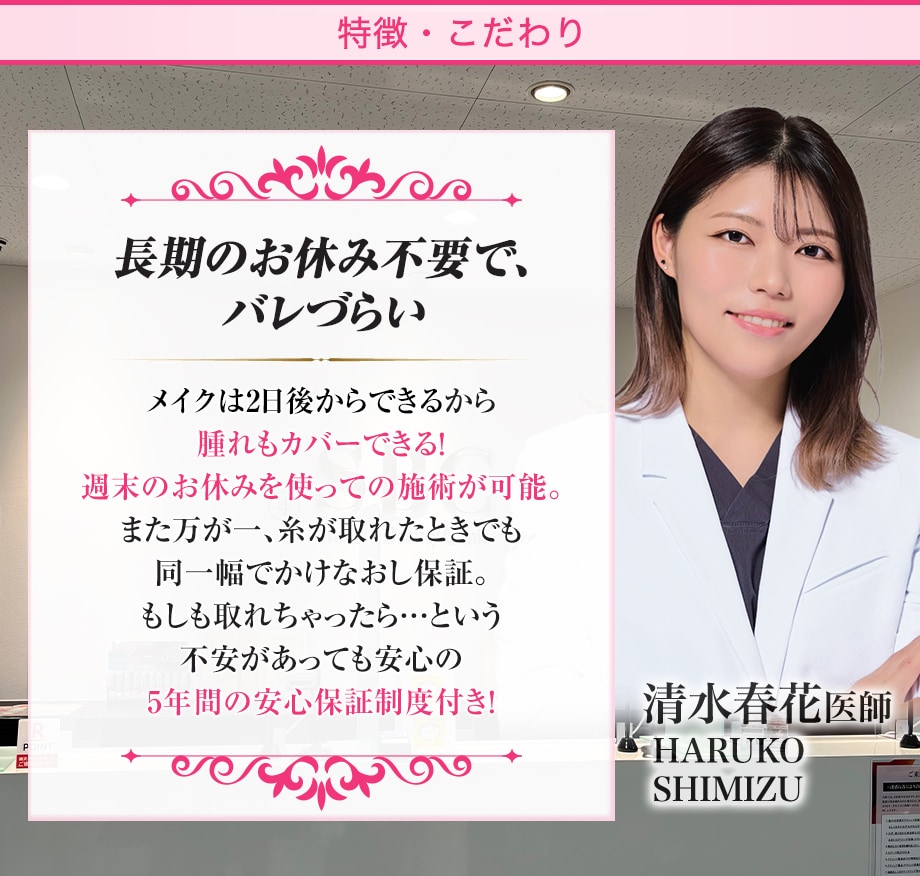 極限まで取れづらい埋没法として研究・開発された二重術で、一生ものの二重を手に入れたい方・幅広の二重をご希望の方・まぶたが厚く、ふたえのりでは希望の二重が作りづらい方におすすめの二重術です。
