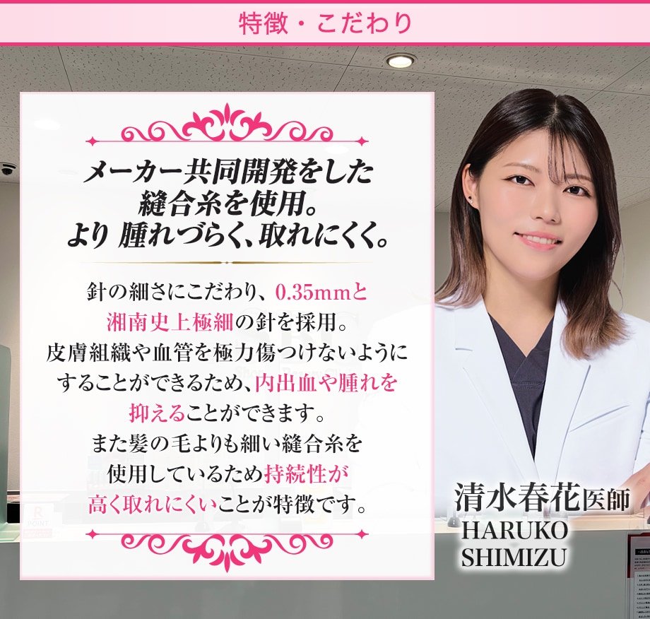 また糸針が細いため、傷跡や糸の結び目が小さく目立ちにくく、自然な二重形成が可能です。