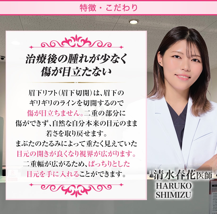 まぶたの余剰皮膚を除去して引き上げ、眉毛に沿って縫合することで、傷跡がほとんど目立ちません。二重術なしで目ヂカラUPや若返りの効果が期待できます。