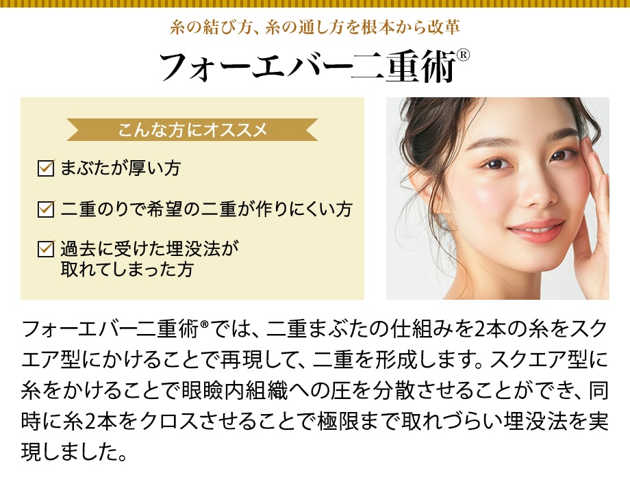 髪の毛よりも細い医療用の糸と二重専用のH・I針を用いる手術です。糸は細くてしなやかなため切れる可能性は少なく生体との反応も安定しています。