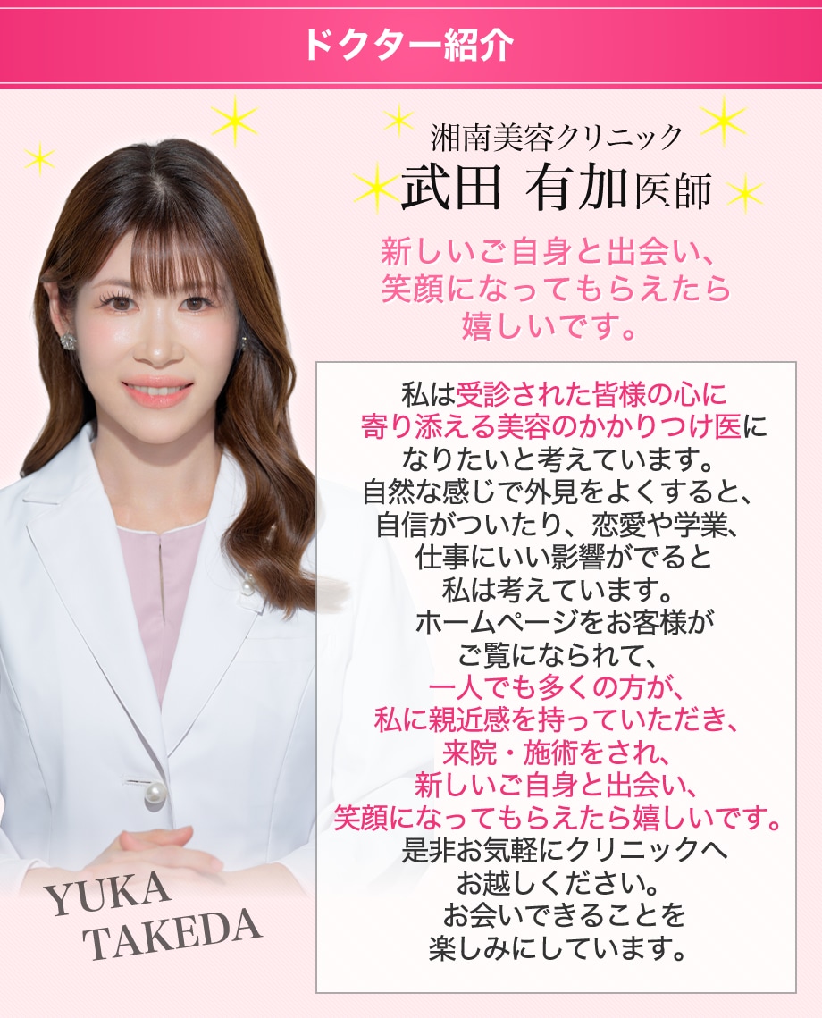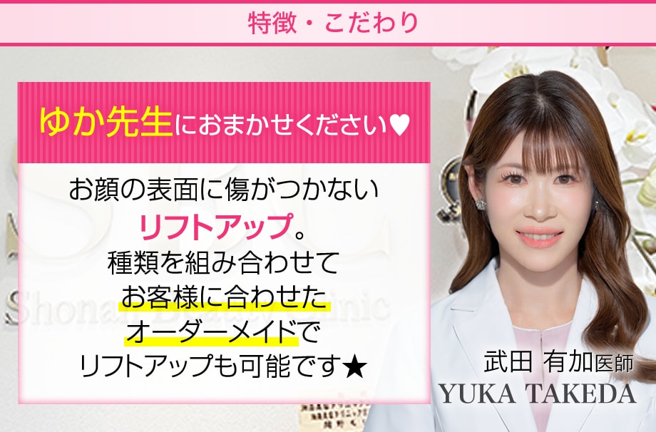 大阪で糸リフトなら、症例件数とデザインセンスで関西のおすすめドクターに選ばれた武田医師をご指名ください!女性ならではの繊細な配慮と仕上がりへの追求で、2024年SBCアワード ドクター部門MVPも獲得しました