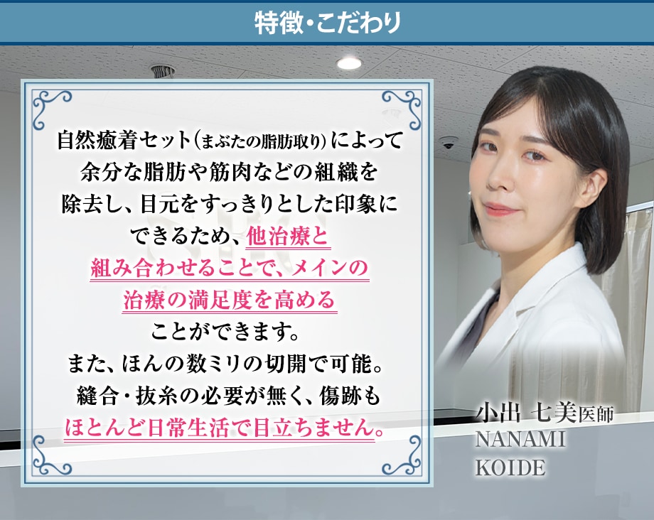 自然癒着セット(まぶたの脂肪取り)は、まぶたをわずか数ミリ切開し、余分な眼窩脂肪を除去することにより、まぶたの分厚さや腫れぼったさを解消することができます。