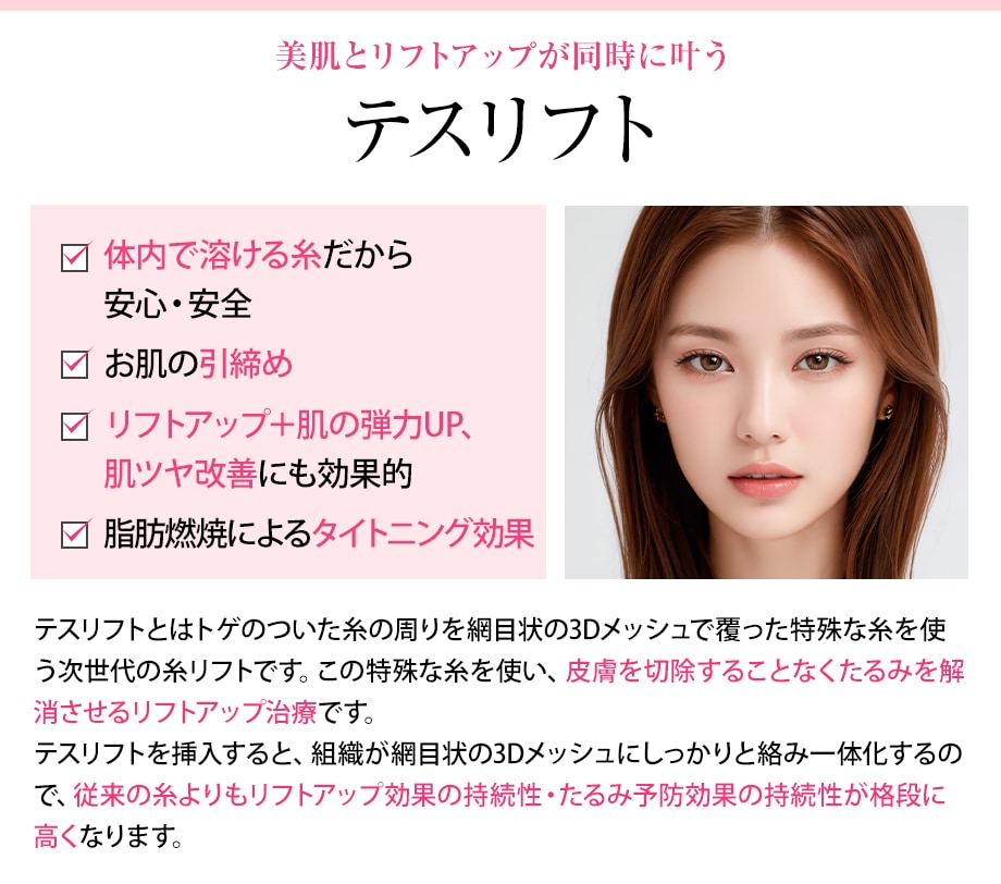 これによりたるみやほうれい線、マリオネットラインや、フェイスラインのもたつきを改善します。 また、糸が挿入されたことの刺激でコラーゲンが増生され、肌のハリツヤをアップさせる美肌効果も。