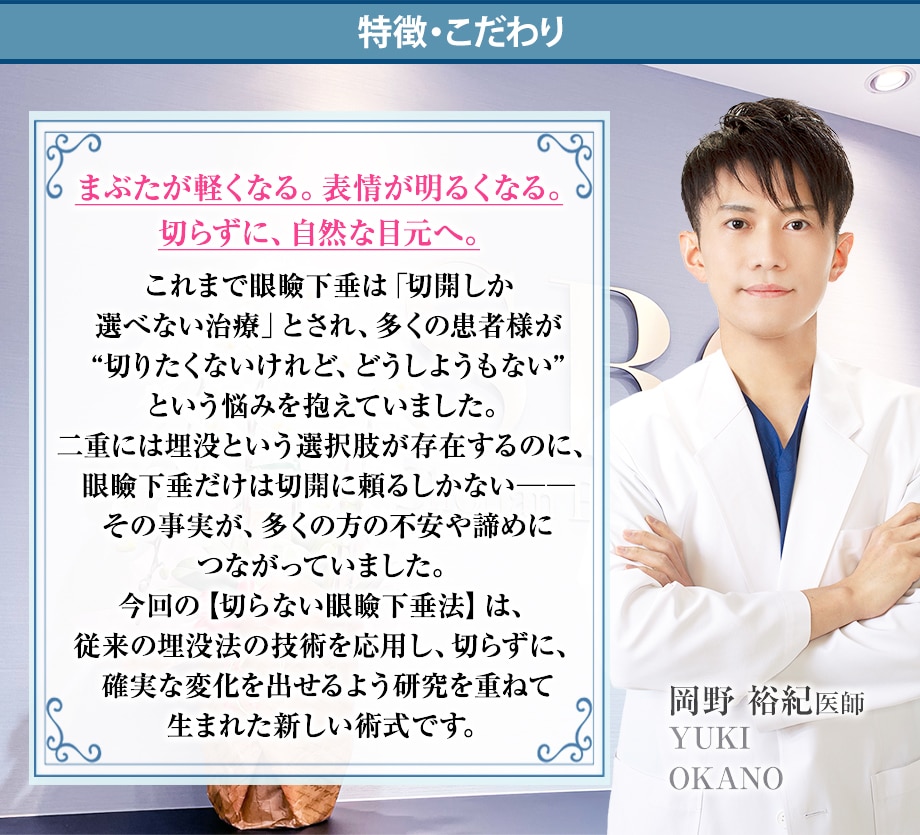 まぶたを切らずに、目の開き・視野・見た目を同時に改善する新しい治療です。
