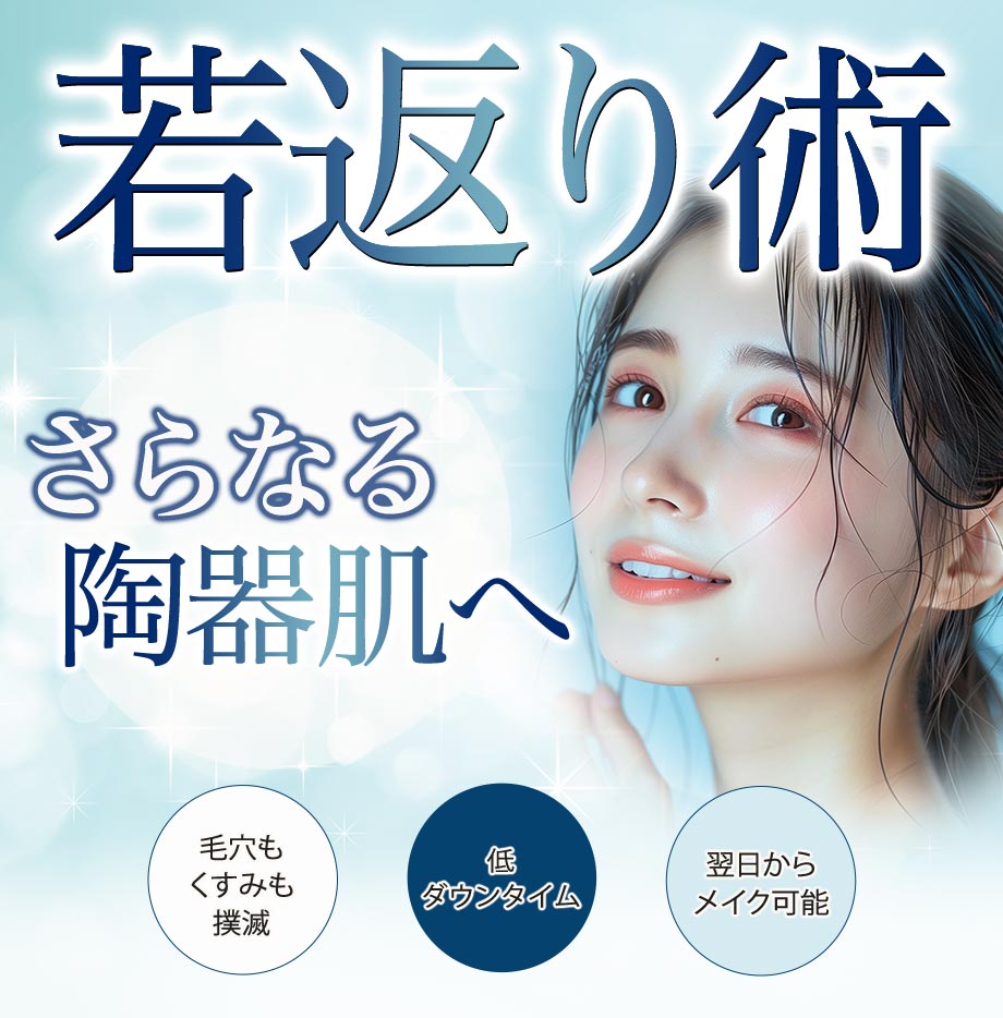 これによって、コラーゲン生成やターンオーバーを促し、肝斑・赤ら顔・ニキビ跡・小じわ・ハリの改善など、総合的な陶器肌治療として効果を発揮します。