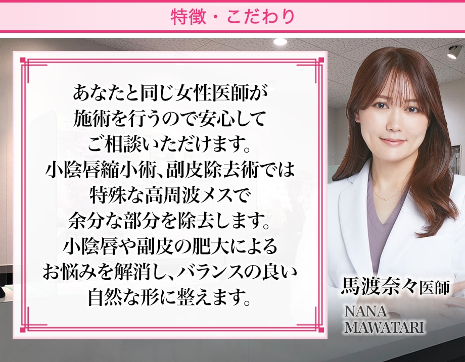 婦人科形成術はデリケートゾーンの形や大きさを整える施術の総称です。女性器は女性の「第二の顔」と称されており、婦人科形成術は世界的に見ても関心が高まっている施術です。形、大きさ、左右差が気になる方、黒ずみが気になる方、ニオイや蒸れなどデリケートゾーンへ一つでも何か気になる方にオススメです。