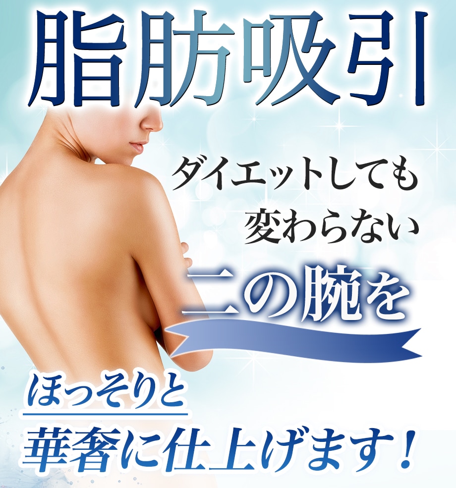 二の腕は、身体のなかでも特に部分痩せしにくいといわれており、ダイエットをしても二の腕だけ細くするのは難しいです。ストレスなく確実に部分痩せするなら脂肪吸引がおすすめです。ぜひご相談ください。