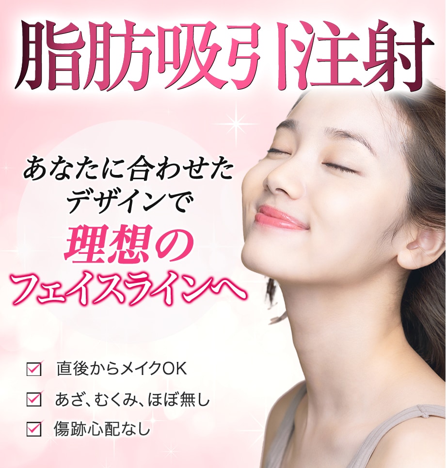 脂肪吸引注射は切開なしで脂肪を直接抽出できるため、脂肪溶解注射より確実かつ、脂肪吸引よりダウンタイムが少なく、狙った部分の脂肪を減らすことができます。傷跡も目立たず、安心・安全・お手軽な部分痩せ術です。