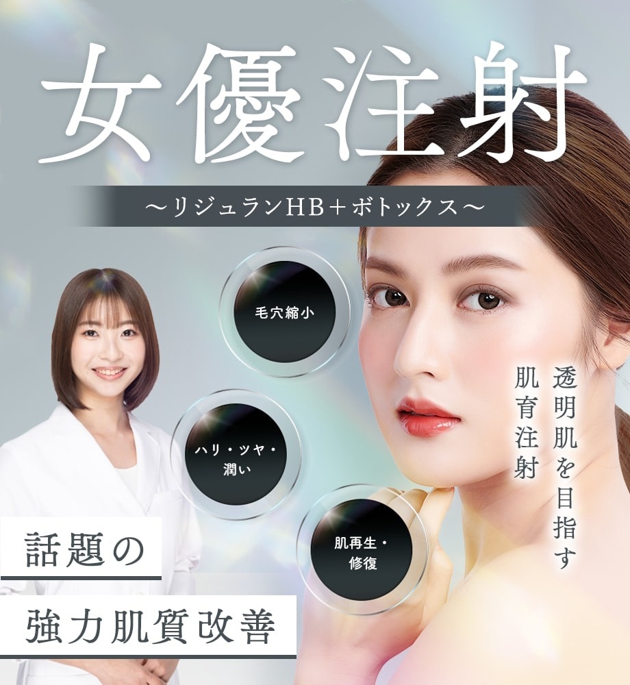 また、皮膚の浅い層(真皮層)に注入することで、ボトックスの持つ毛穴縮小・皮脂抑制作用が効果を発揮します。これらの作用を直接肌に注入することで、透明肌へと導きます。