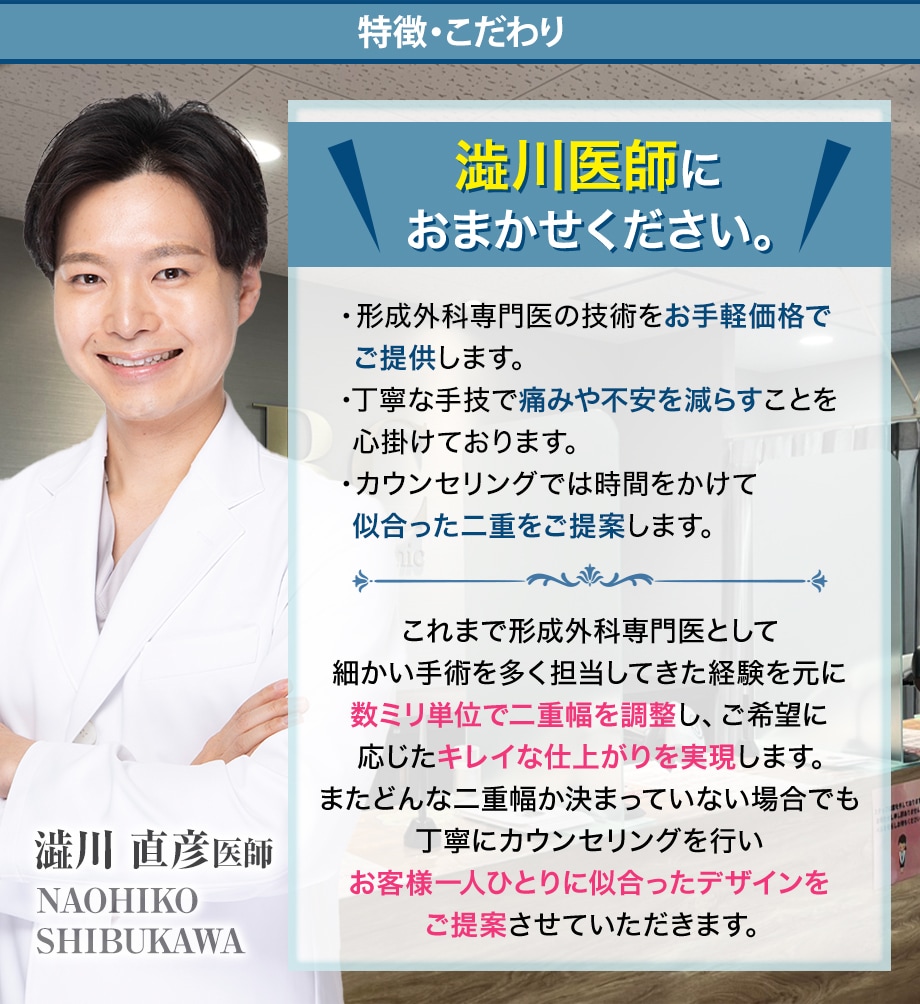 形成外科専門医としての高度な知識・技術・経験を活かしてご希望に応じた二重を実現します。