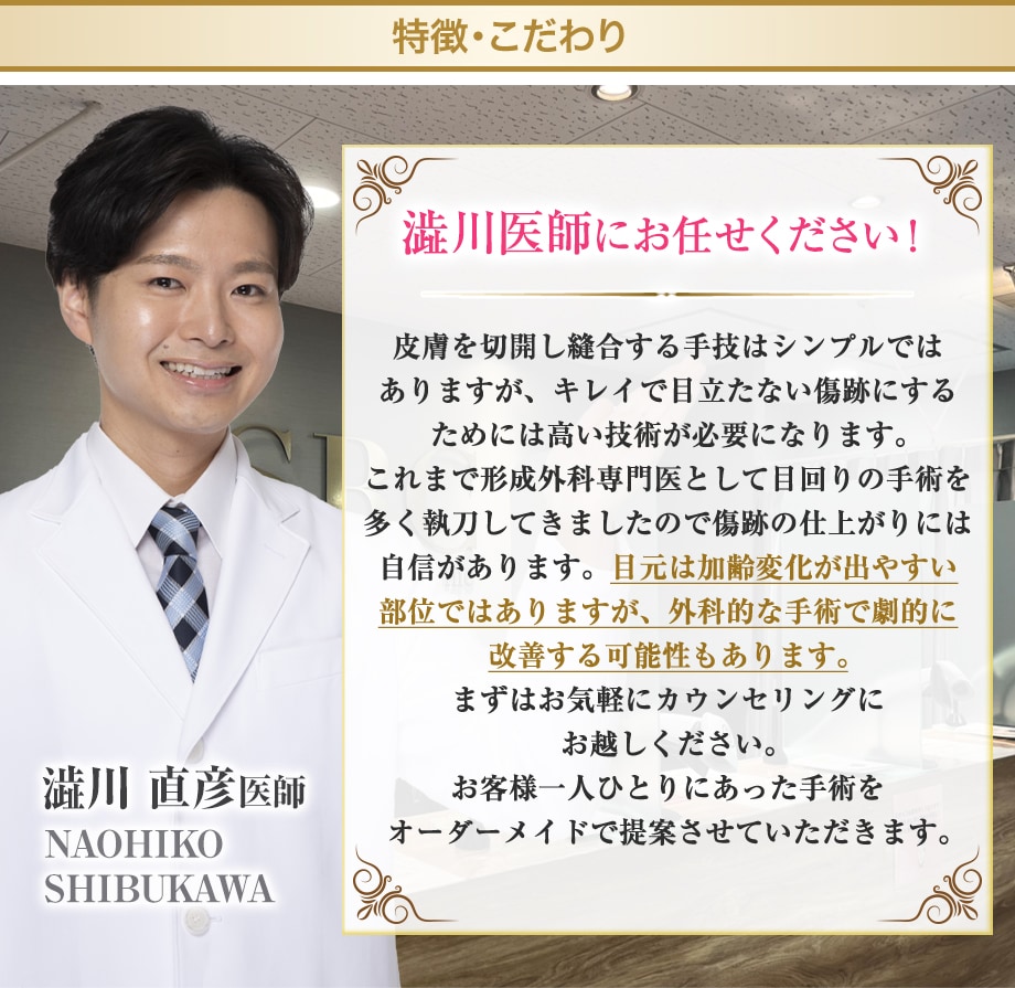 高い知識・技術・経験をもつ形成外科専門医のおしぶ先生があの頃の目元を取り戻します。