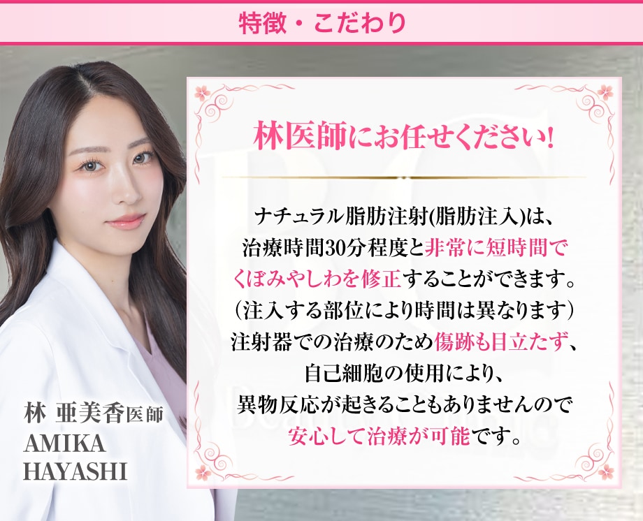 ご自身の太ももなどから吸収した脂肪を注入し、より自然な仕上がりで長持ちする効果が期待できるナチュラル脂肪注射!男性医師に抵抗があるなら優しく丁寧な女医・あみか先生にお任せしてみませんか?
