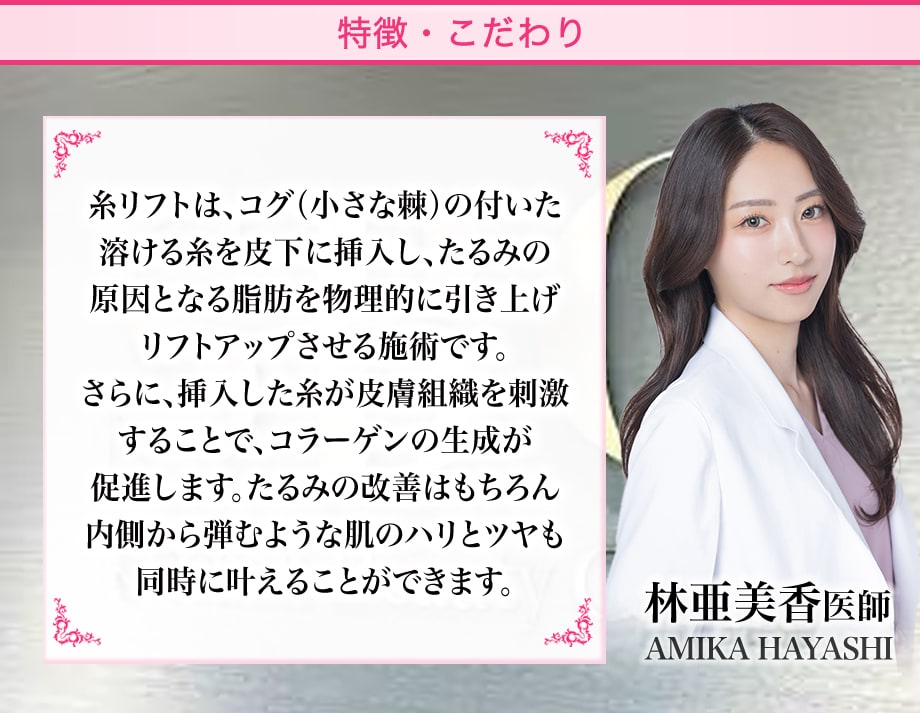 糸リフト(スレッドリフト)は、コグが付いた糸を皮下に挿入しお顔の垂れ下がった下垂脂肪を直接持ち上げ、高い位置に脂肪を再配置する施術です。たるみやほうれい線、マリオネットラインやフェイスラインのもたつきの改善が期待できます。