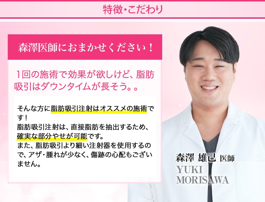 切開なしで脂肪を直接抽出できるので、脂肪溶解注射より確実に、脂肪吸引よりダウンタイムを少なく、狙った部分の脂肪を減らすことができる安全・確実・簡単な部分やせ術です。