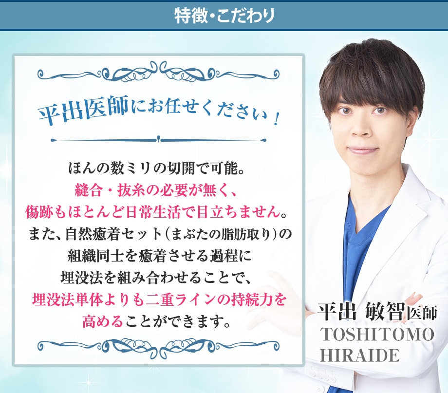 眼窩脂肪除去の過程で癒着を促すため、埋没法単独でするよりも二重のラインが維持されやすくなり、より持続力をアップさせることができます。