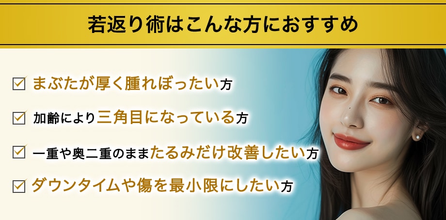 瞼の上のたるみや、消えない額のしわ、ボトックスを額に打って重たくなった方など、瞼のたるみを改善することで 以前の若々しい目元に若返ります。