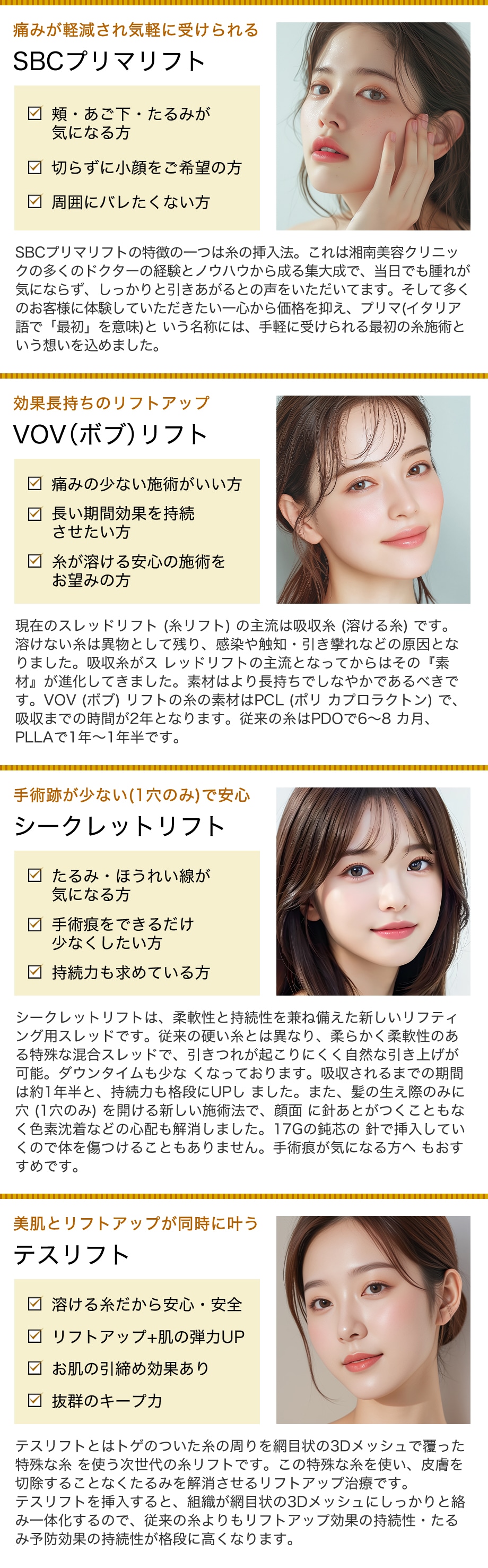 安全な溶ける糸リフトで、たるんでしまった皮膚を引き上げ、手軽にリフトアップ!