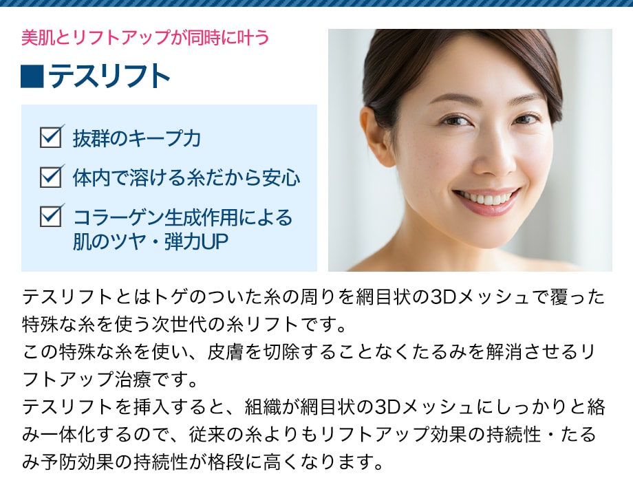 たるみやほうれい線、マリオネットラインやフェイスラインのもたつきの改善だけでなく、糸を挿入することで皮膚の組織が活性化し、コラーゲンが増生され、お肌のハリ・ツヤアップも期待できます。