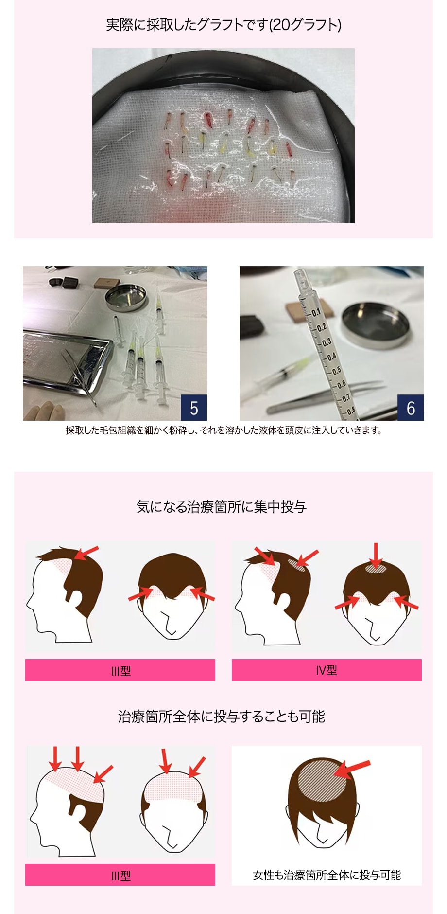 毛根再生注射は、自身の健康な毛包組織を採取し、それを液状化したものを薄毛部位に注入する施術です。弱毛化した細い毛を太く強く再成長させる治療です。