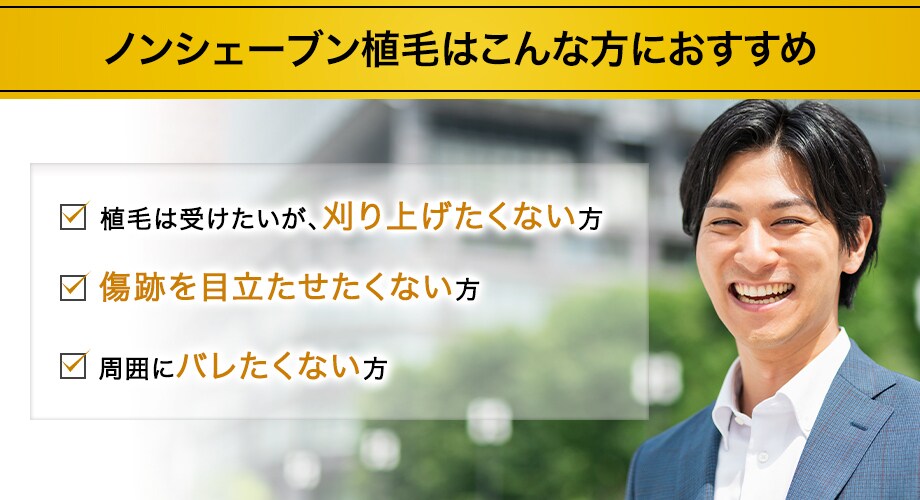 周囲に気づかれずに治療を受けたい方に最適な「ノンシェーブン植毛」では、多くの患者様から支持を受けています。この技術は、従来のFUE植毛とは異なり、後頭部全体を剃らずに、採取する毛のみを一本一本慎重にカットして行います。術前と術後の見た目に変化がほとんどないため、安心して治療を受けられます。