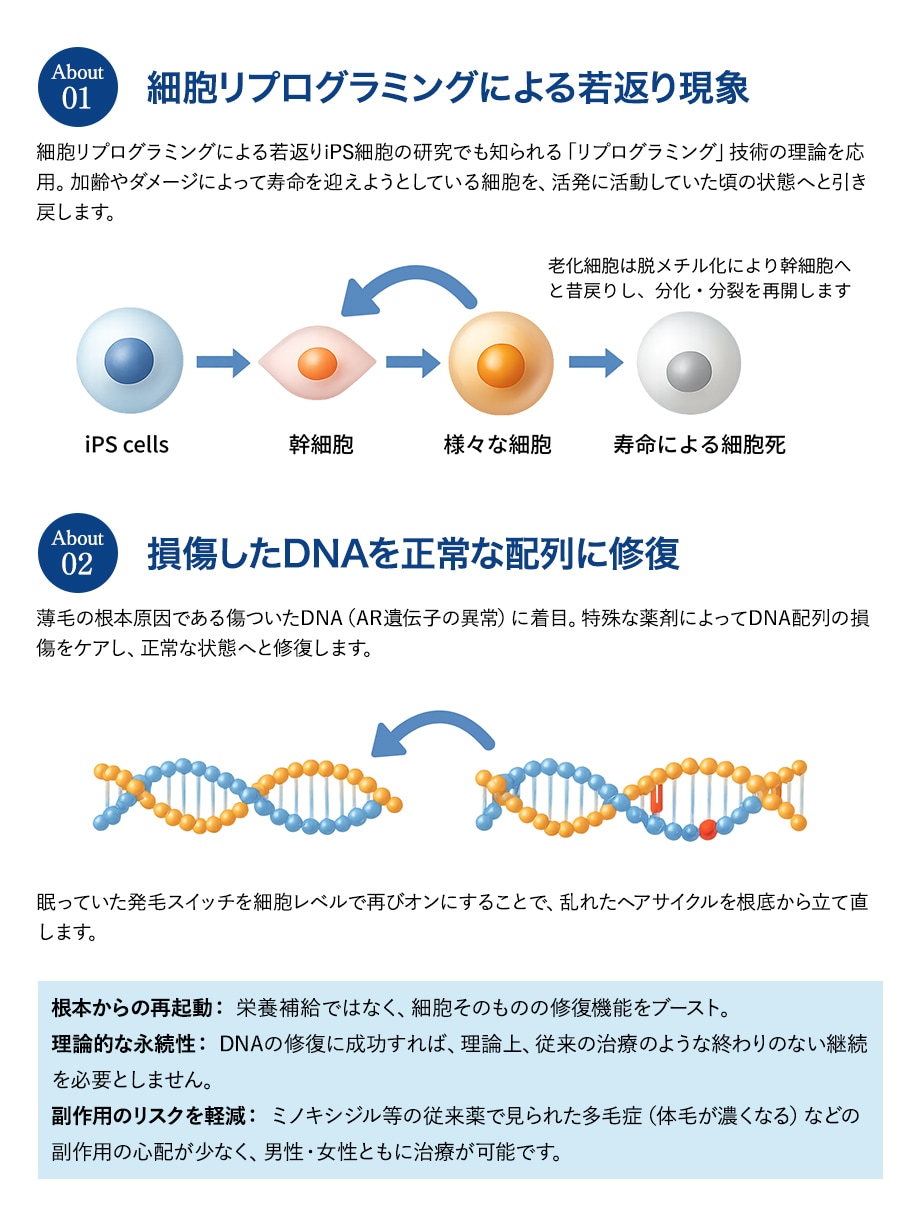 この治療は、特定の薬剤を用いて体内のDNA修復機能を活性化させ、AGAの根本原因となるAR遺伝子(アンドロゲン受容体遺伝子)を正常な状態へと導く、いわば発毛の再プログラミング。実験データでは、実に約8割の遺伝子修復という驚異的な結果が確認されています。