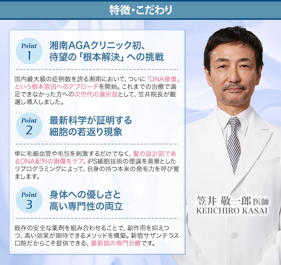 薄毛の運命は、DNAから変えられる時代へ。新宿サザンテラス口院の笠井院長が新たに導入するのは、従来の維持や促進の域を超えた、次世代のDNA修復毛髪再生治療です。