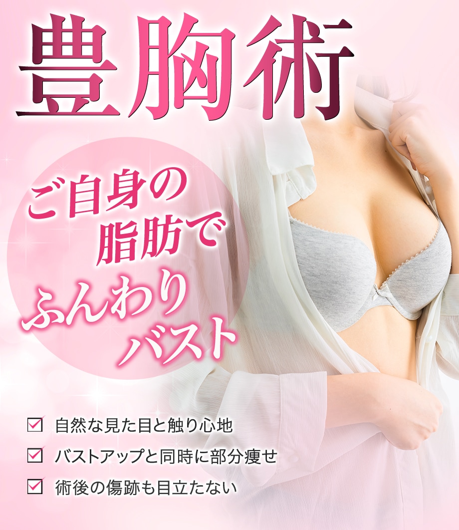 ご自身の気になる部分の脂肪を吸引し、その脂肪細胞を胸部に注入します。脂肪注入豊胸は、人工的な注入剤には抵抗がある方、自然な触り心地・形でバストアップしたい方、部分痩せしたい体のパーツがある方におススメです。ボディラインをスレンダーにしつつ、バストアップが出来る豊胸術です。