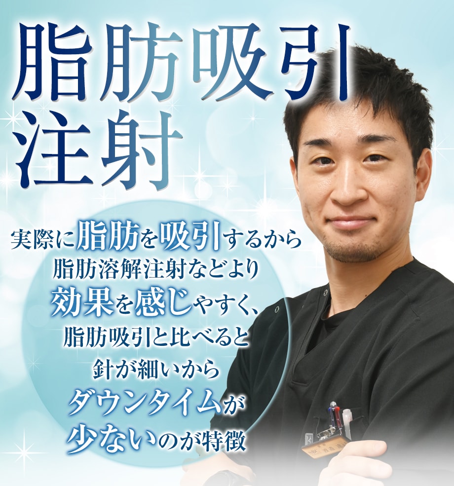 脂肪を直接抽出できるので、脂肪溶解注射より確実効果を感じることができ、切開しないため脂肪吸引よりダウンタイムを少なくすることが可能。狙った部分の脂肪を減らすことができる安全・確実・簡単な部分やせ術です。施術直後からメイク可能で、速攻小顔。翌日出社してもバレにくい施術です。