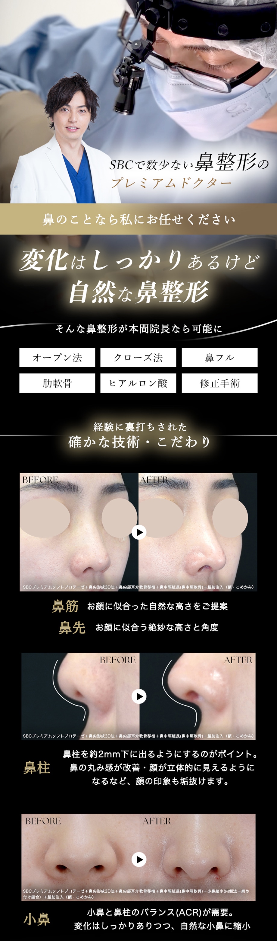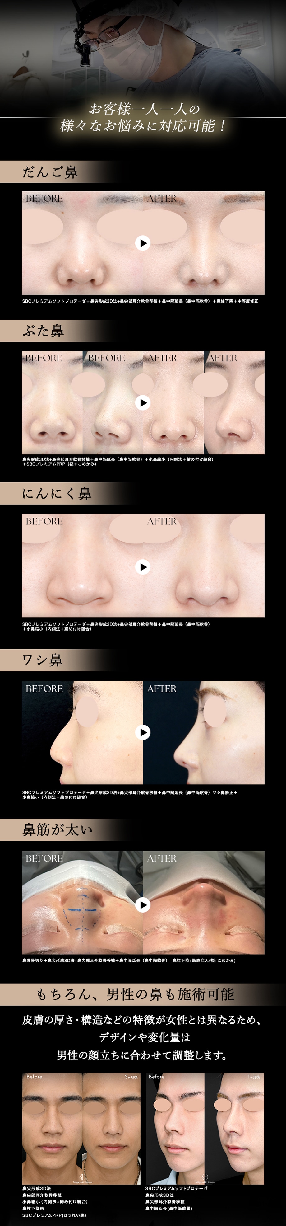 鼻整形といったら本間医師!というほど!症例を見ていただいたSBCのスタッフ・ドクターから鼻整形の指名も大変多く、信頼の厚いドクターです。技術力はもちろん、ミリ単位にこだわって丁寧に鼻を形成するからこそ、【変化はしっかりあるのに、自然な鼻】に仕上げることが可能。カウンセリング(無料)では、3Dシミュレーションで術後の顔を実際に見ながら診察を行います。