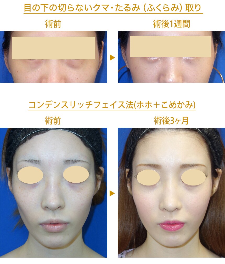 | 目の下の切らないクマ・たるみ(ふくらみ)取り(麻酔(局所麻酔)代が含まれています。※別途安心麻酔(静脈麻酔)代がかかります。 ) | 79,100円 |