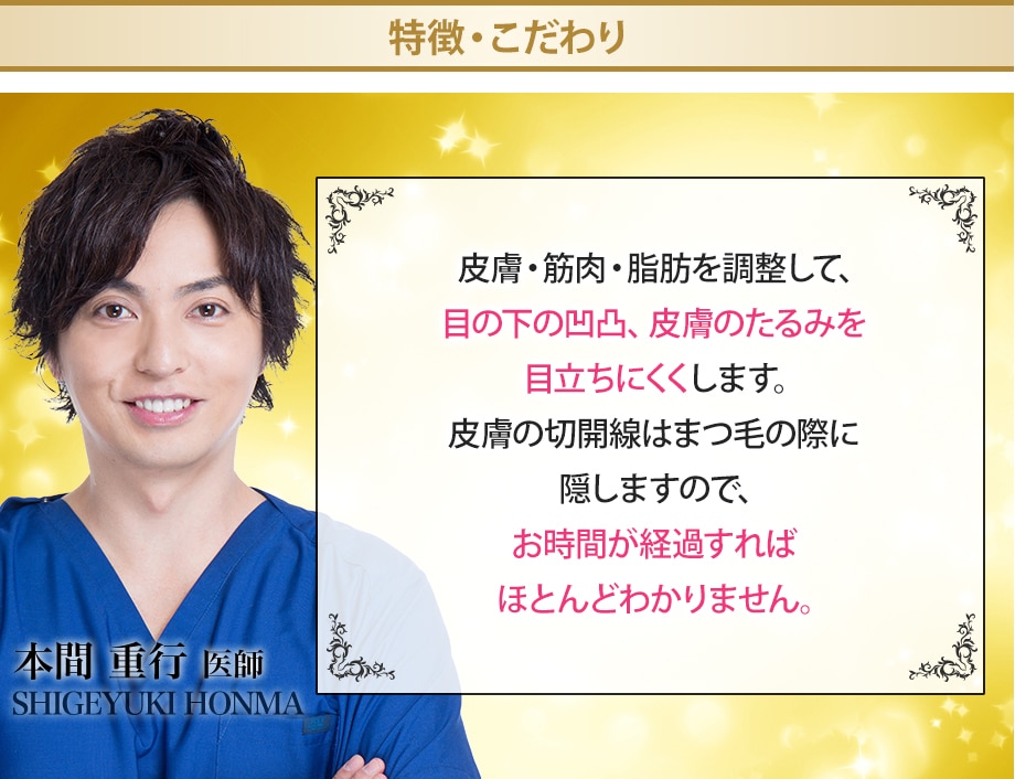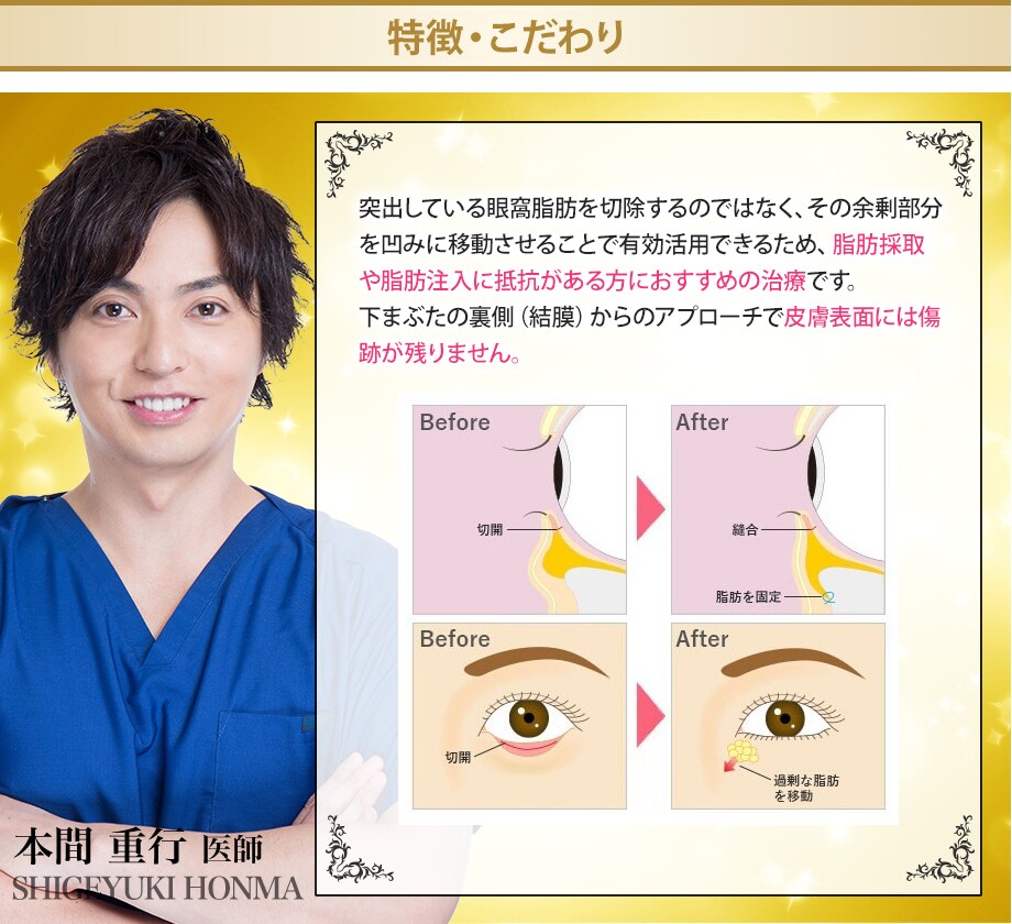 膨らんでいる部分からくぼんでいる部分に眼窩脂肪を移動させることで、膨らみと溝を同時に改善し、フラットな状態にすることができるため、眼窩脂肪を切り離すことなくクマを改善することができます。