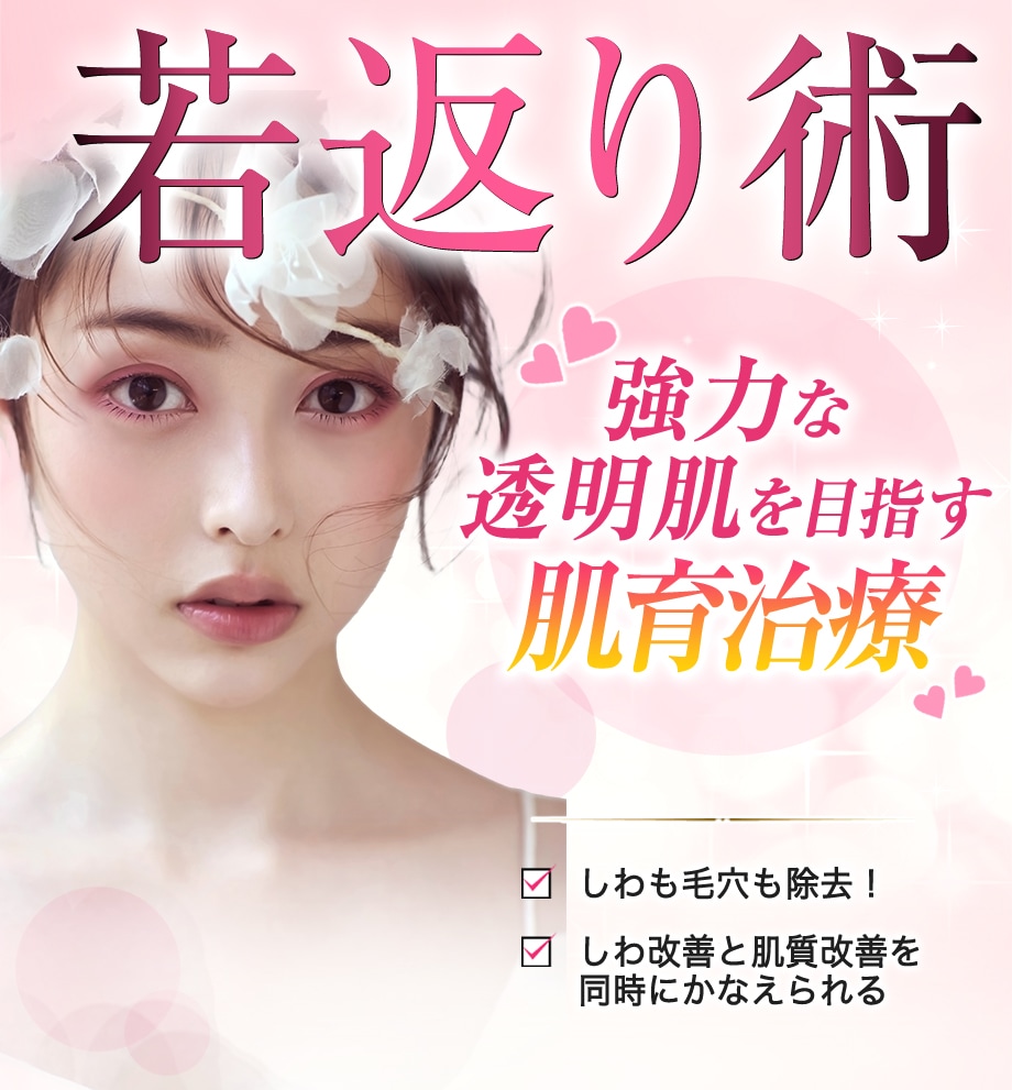 女優注射®は、小じわ・毛穴・ハリ/ツヤ改善が期待できる治療です。細胞再生・自己再生力を促す働きがある【リジュラン】により、保湿力・肌の弾力を回復させ、しわを目立たなくします。また、ボトックスの持つ毛穴縮小・皮脂抑制作用が効果を発揮することで、透明肌へと導きます。