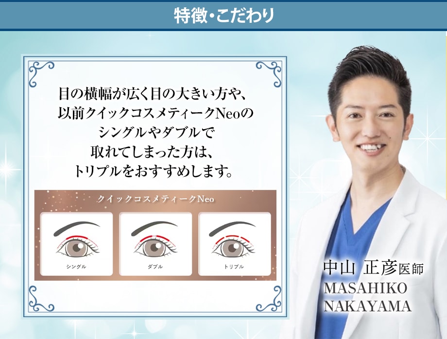 クイックコスメティークNeoは使用する本数に応じて、シングル・ダブル・トリプルに分かれており片目に使用する糸の本数を表しています。糸の本数が増すごとに持続力が上がるため取れづらい埋没法をご希望の方は、ダブル以上をおすすめします。