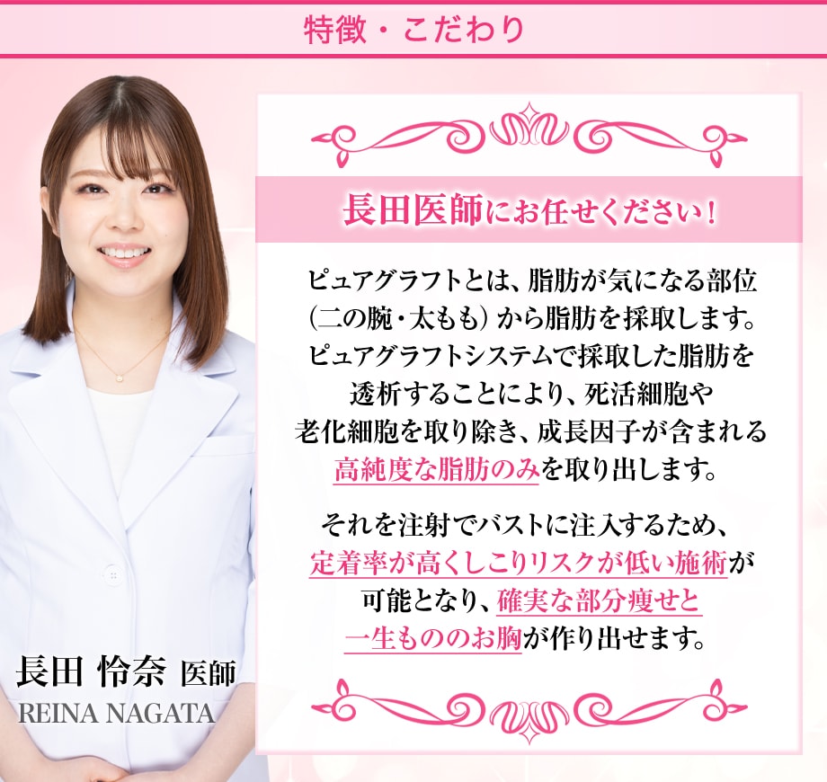 「週末豊胸 -ピュアグラフト-」は、名前の通り翌日からお仕事ができる豊胸術です。※なぜ、週末に手術が可能かと言うと、1.しっかりと脂肪を取る脂肪吸引とは違い胸に入れる量だけの採取のため、腫れや痛み等のダウンタイムが少ない点2.脂肪採取部の傷は5ミリ程度、胸の傷は3ミリ程度と傷口が痛むことはない点があげられます。長い休みが取れない方、周りの方にバレたくない方におススメです。※圧迫期間に変更はありませんが、洋服などで隠れますので翌日からお仕事可能です。