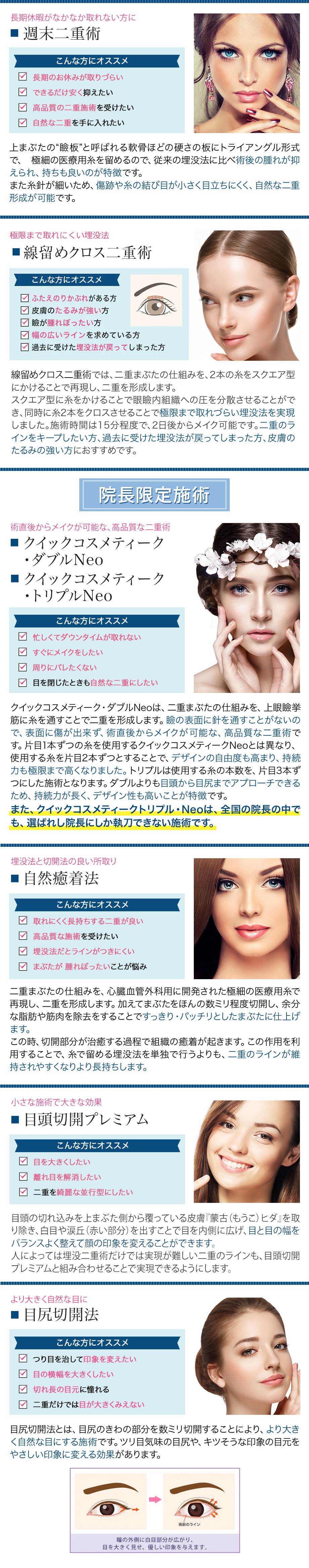 リーズナブルな価格で受けられる二重術をはじめ、できるだけ耐久性を重視した方向けの方法であったり、瞼の表面に傷跡や埋没法特有の糸玉などができず二重整形がバレない方法など、たくさんのお客様のご要望に応えられるように様々な手術方法を取り揃えております。