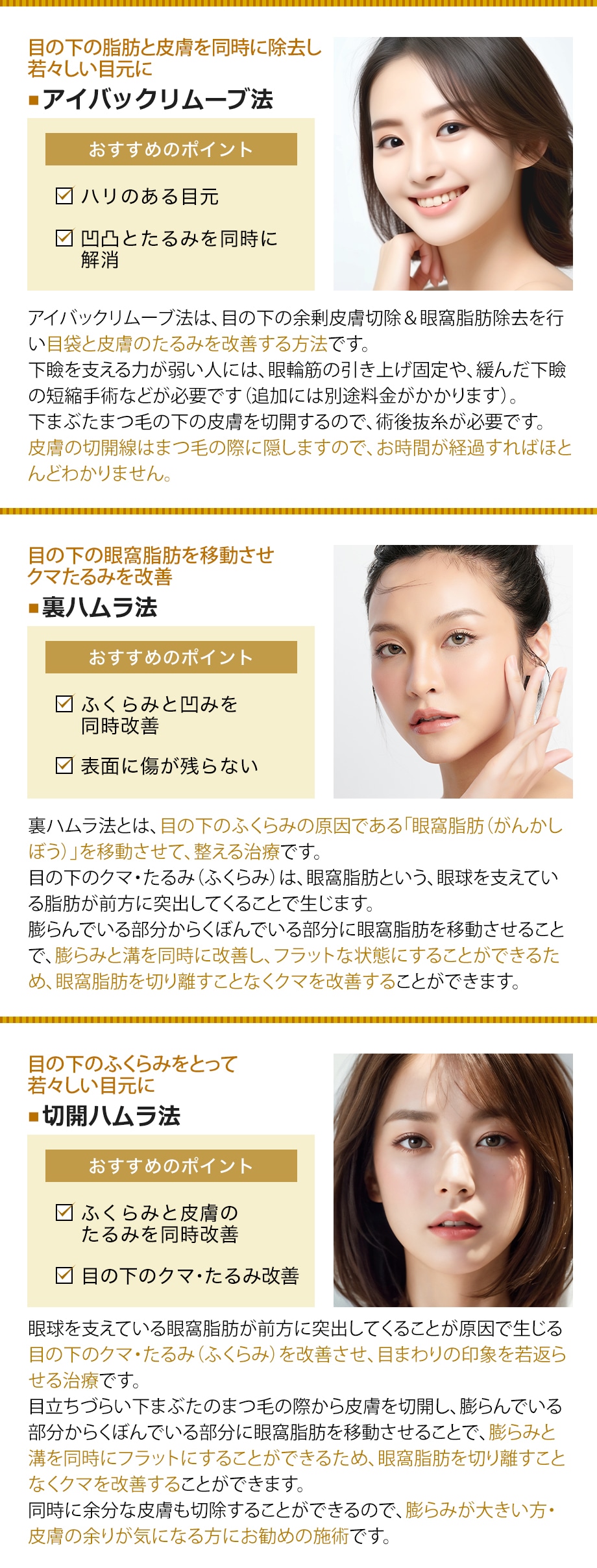 目元のクマ・たるみを除去して若々しく美しい目元へ導きます。