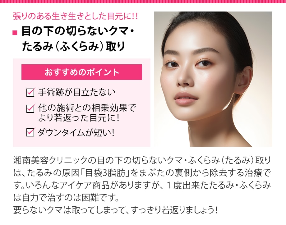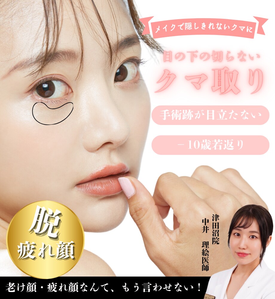 これが老け見えや疲れ顔、不機嫌顔の原因になり、一度できてしまった目の下のクマやたるみは、マッサージや化粧品などのセルフケアでの解消は難しいのが現実です。