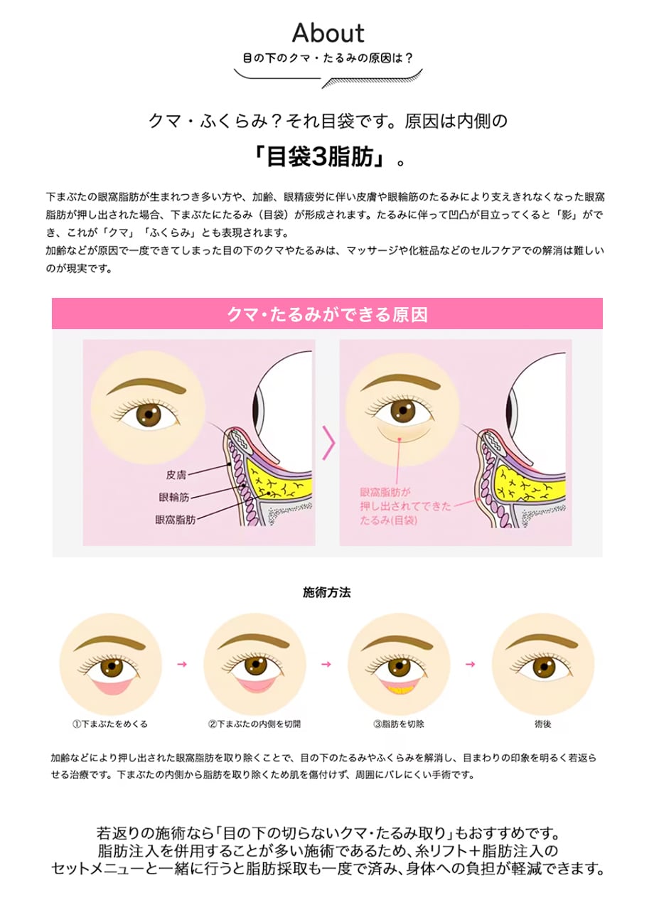 クマは眼窩脂肪という目周りの脂肪が押し出されることによって出来るふくらみやたるみが原因です。