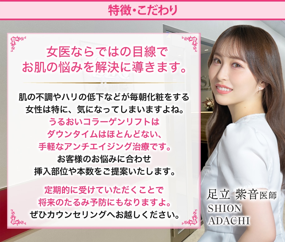 うるおいコラーゲンリフト(ショッピングスレッドリフト)は施術後のダウンタイムや痛みが少なく、引き締め効果・肌のうるおい、つやを体感できる、今もっとも注目される最新のアンチエイジング治療です。