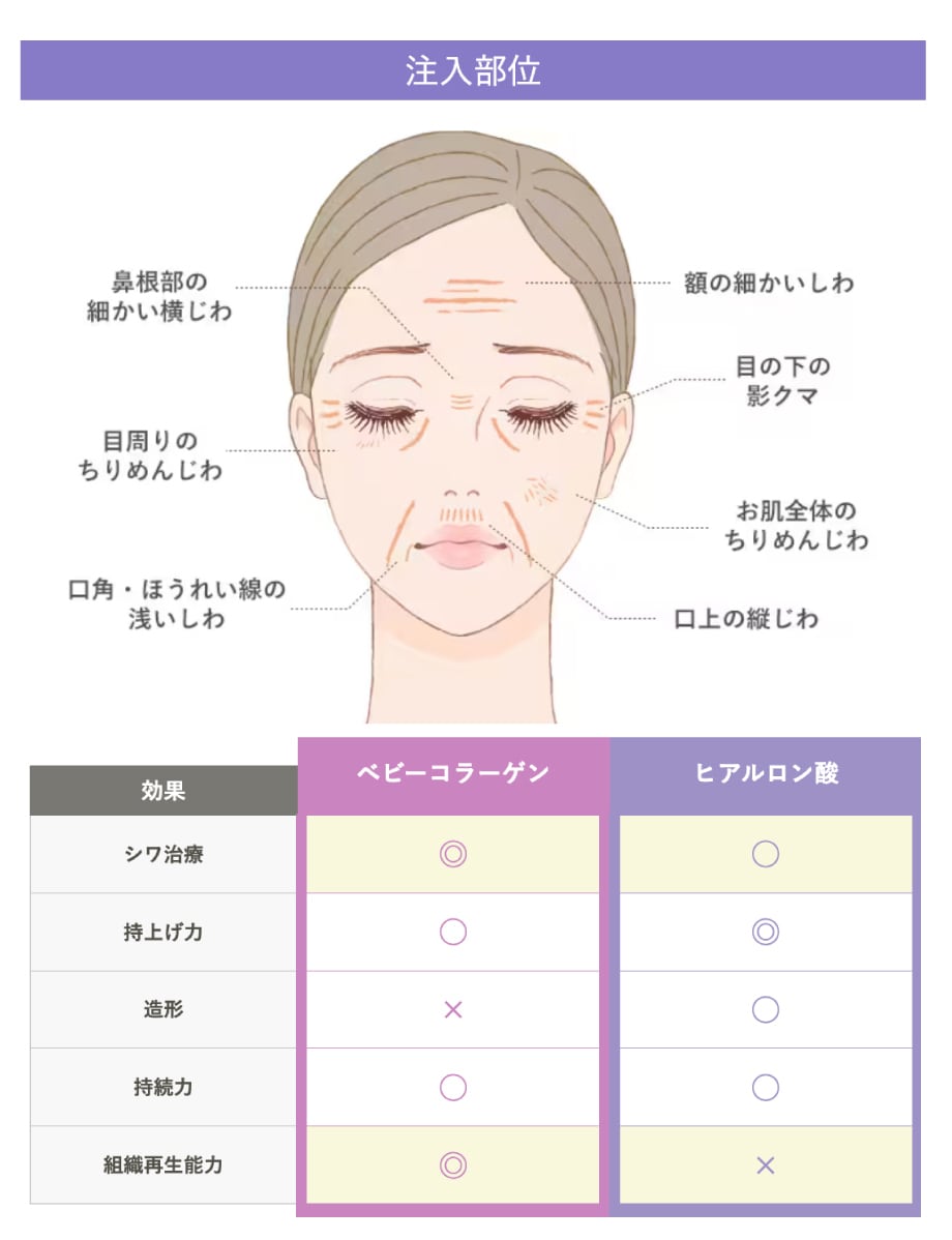 ベビーコラーゲンは、コラーゲンの注入治療です。ヒアルロン酸のように小じわ、やほうれい線、目の下の凹みなどのボリュームを出したい部分などに注入します。赤ちゃんのプルプルとした肌に含まれるコラーゲン(ベビーコラーゲン)は「Ⅲ型コラーゲン」です。治療に使用する製剤はⅠ型コラーゲンとⅢ型コラーゲンを50:50で配合された、世界初のヒト胎盤由来コラーゲン注入剤です。ヒト由来のコラーゲンを使用しているため、アレルギーの心配も少なく安全に治療を受けていただけるのも特徴です。