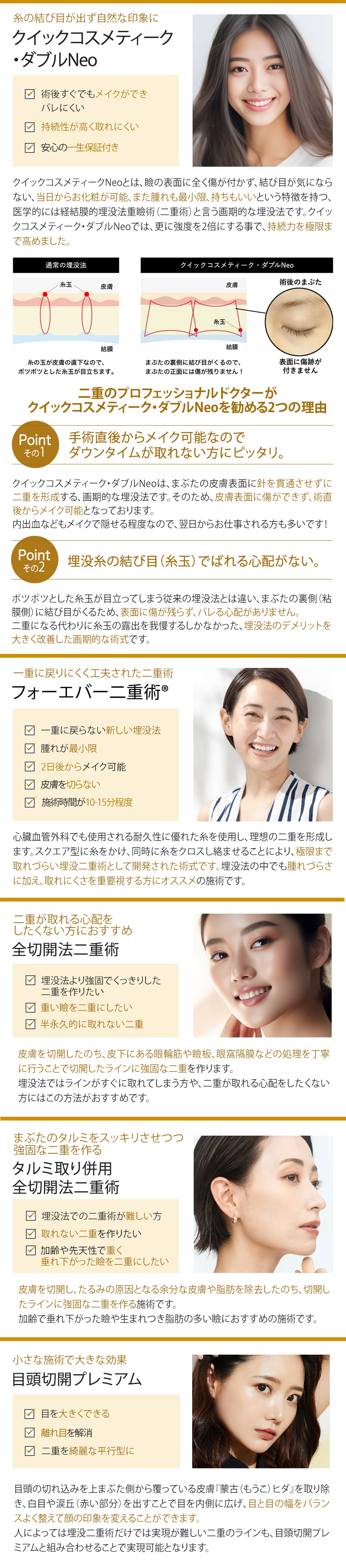 限られたドクターしか施術が認められていない、最高品質の埋没法『クイックコスメティーク・ダブルNeo』から、半永久的な二重が叶う『全切開二重術』まで、なりたい二重の形や幅、まぶたの状態に合わせて幅広くご提案いたします!