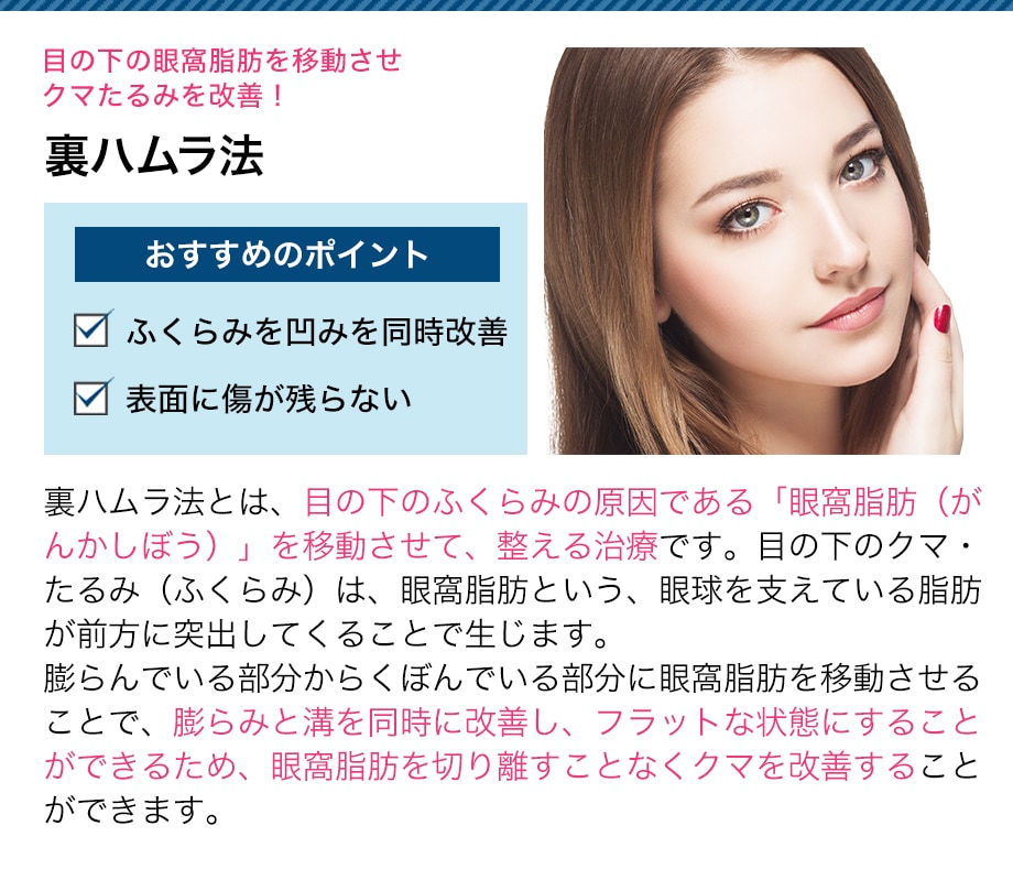 下まぶたの眼窩脂肪が生まれつき多い方や、加齢、眼精疲労に伴い皮膚や眼輪筋のたるみにより支えきれなくなった眼窩脂肪が押し出された場合、下まぶたにたるみ(目袋)が形成されます。 たるみに伴って凹凸が目立ってくると「影」ができるようになり一般的には「クマ」と表現されます。この眼窩脂肪を除去することにより目の下のたるみやふくらみを改善させ、目まわりの印象を若返らせることができます。また、脂肪注入を併用することでたるみや影のない、ハリのある若々しい目元が手に入ります!