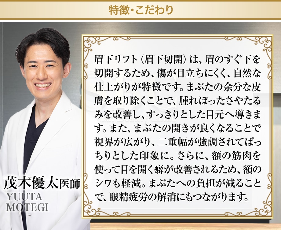 眉下リフト(眉下切開)は、まぶたのたるみを解消し、自然な若々しさを取り戻す施術です。