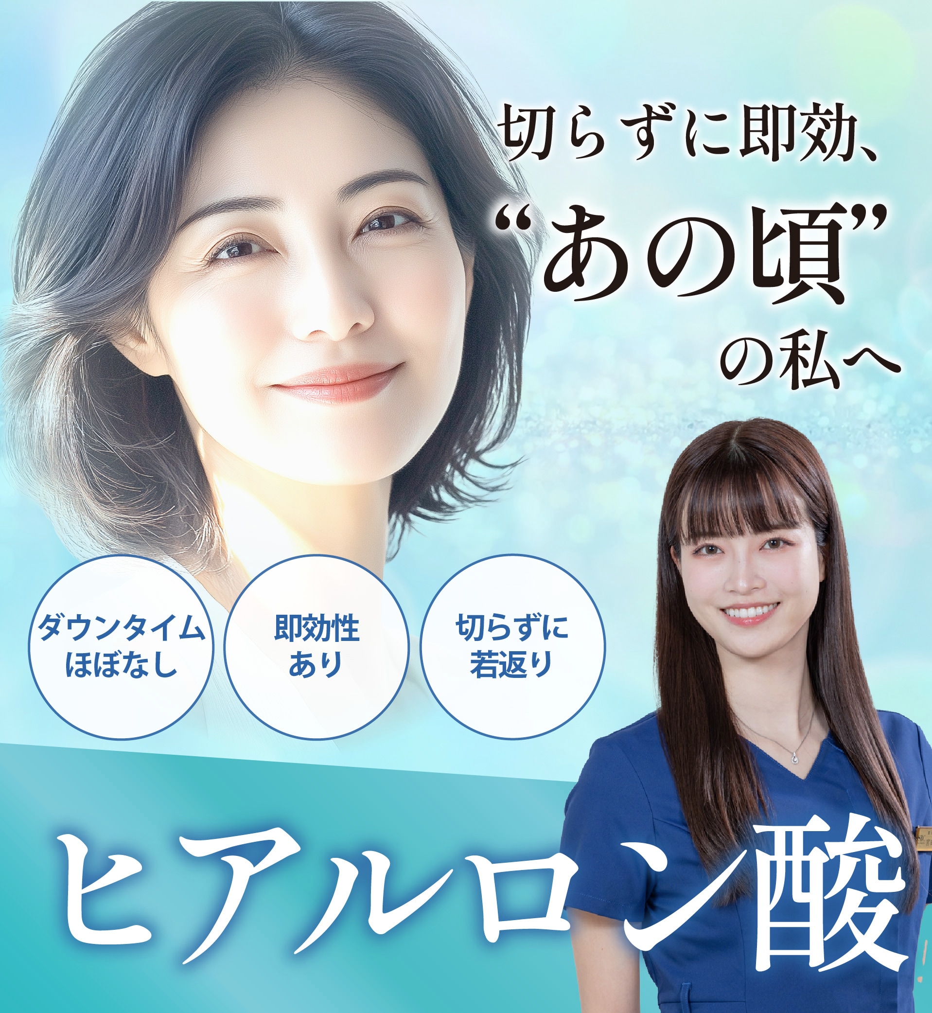 ヒアルロン酸は、しわ、ゴルゴ線のお悩みはもちろん、お顔のリフトアップ、鼻を高くしたい方、輪郭・アゴをシャープにしたい方、唇のボリュームアップ、涙袋をお望みの方等にも適した治療法です。 お悩みやお肌の状態に合わせた最適なヒアルロン酸を選択することが大切ですので、カウンセリングの際にはお気軽にご相談ください。