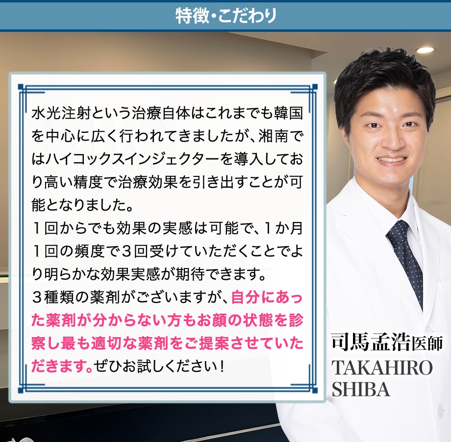 ハイコックスインジェクターを使用し薬液を顔全体に届けていく治療です。各薬剤ごとの固有の肌質改善効果に加え、注射針による創傷治癒反応によって体内由来のコラーゲンやヒアルロン酸の産生を促す効果があります。選べる薬剤には、しみ・くすみの改善効果に優れた美白水光注射、小じわやニキビ跡の改善効果に優れたジュべルック、強力な毛穴改善効果のある女優水光注射がございます。