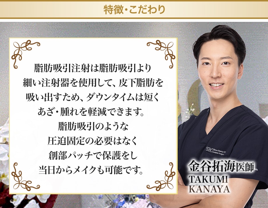 脂肪溶解注射のように、脂肪を溶かすわけではなく、脂肪吸引の技術を応用し、直接脂肪を抽出するため、確実な部分やせが可能です。また、従来の脂肪吸引では、3mm~5mm程度の傷口がありましたが、小顔用脂肪吸引注射では、1.6mmの極細の針から脂肪を吸い出すため、傷跡の心配はほとんどありません。