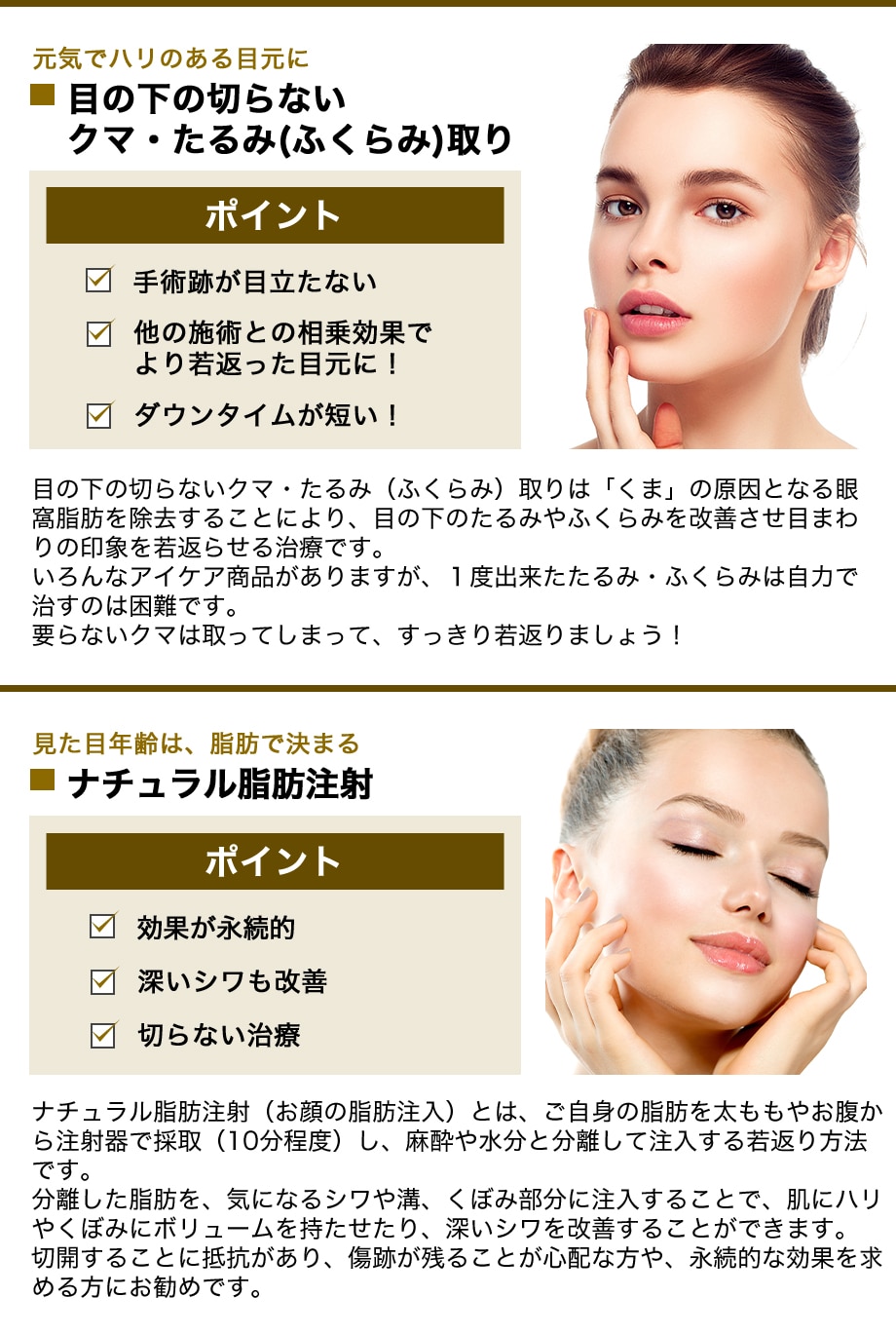 しかし、たるみや凹凸が強い場合、脂肪を除去すると逆にくぼみが目立つことがあります。そのため、脂肪注入を併用することで、フラットでクマが目立たない目元を実現し、ハリのある若々しい印象に仕上げます。