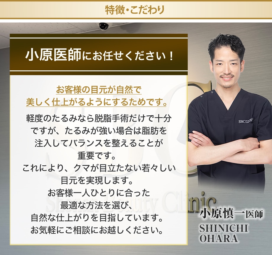 目の下のたるみや凹凸が軽度の場合、脱脂手術のみで改善が期待できます。