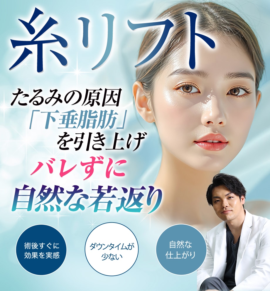皮下組織にとげの付いた溶ける糸を挿入し、下がった下垂脂肪を引っ張り上げる事でたるみやほうれい線、マリオネットラインや、フェイスラインのもたつきを改善します。今まで色々セルフケアをしてみたけど改善しない…。できるだけダウンタイムが少なく、すぐに効果が欲しいという方におすすめなのが糸リフトです。